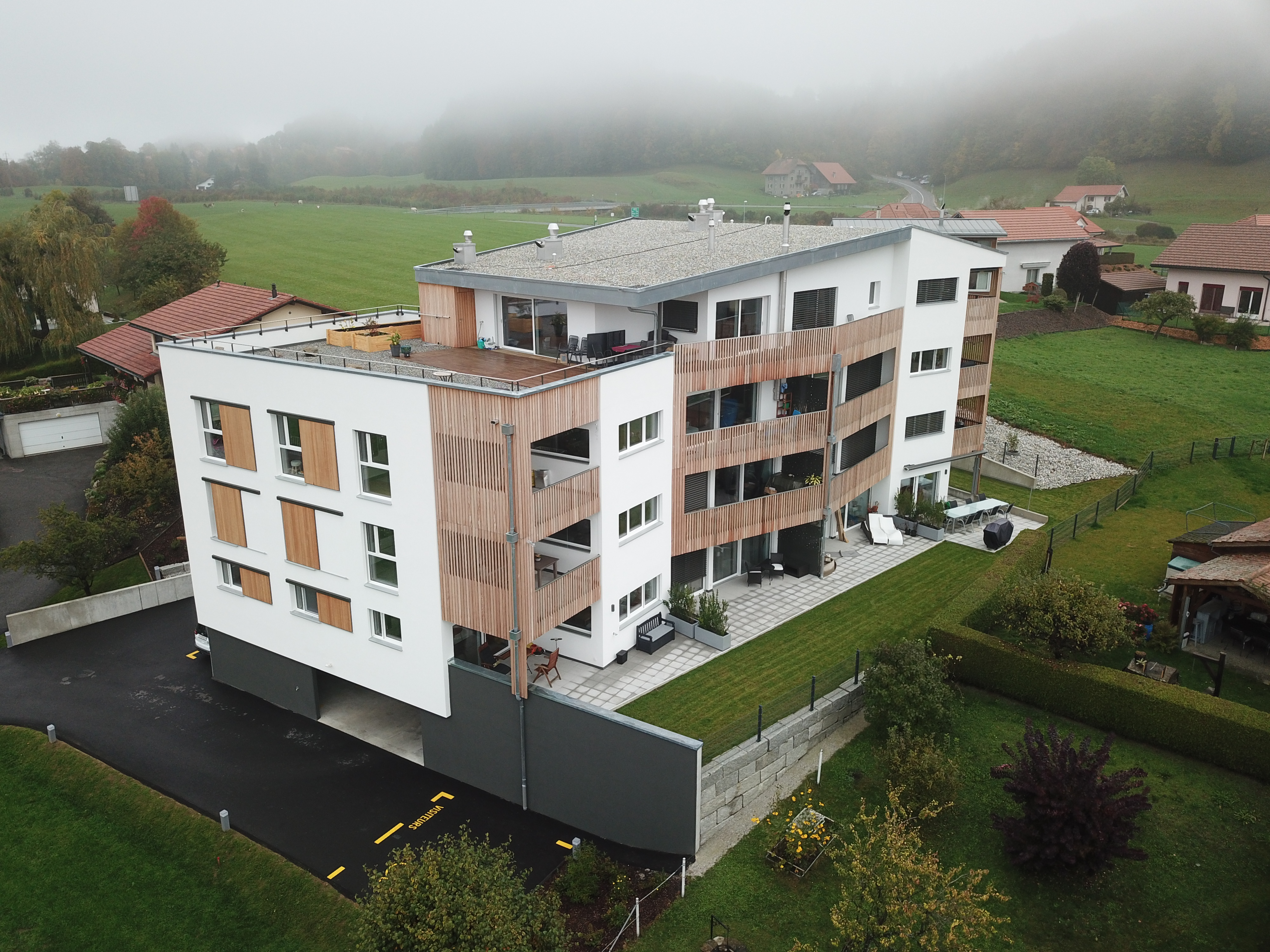 Ensemble de 4 immeubles certifiés Minergie à la sortie d’Attalens. Minergie / Immeuble PPE / 63 appartements